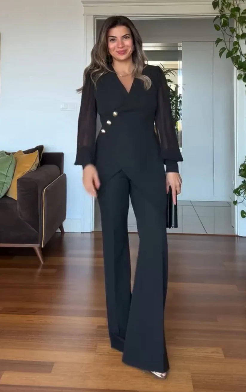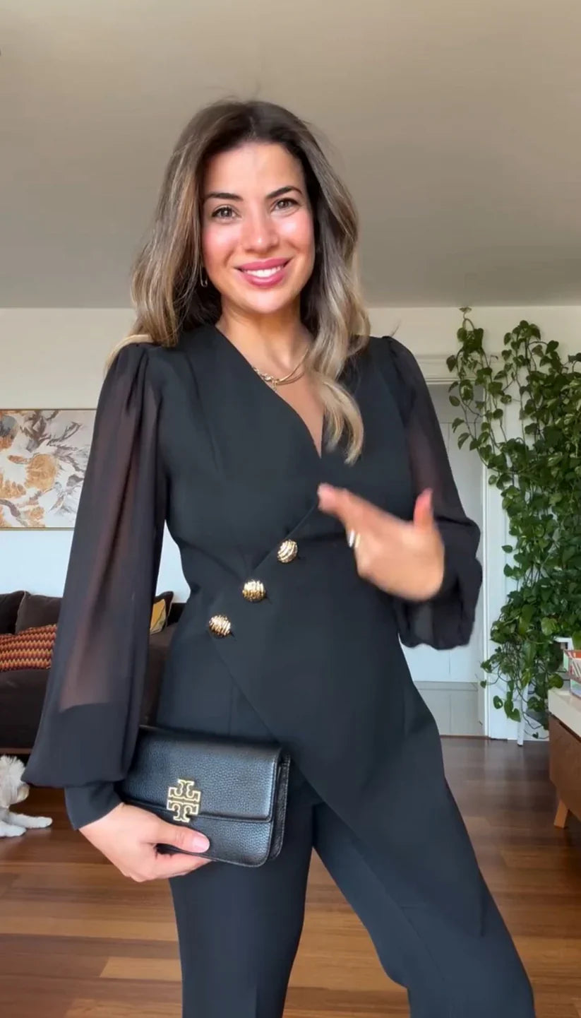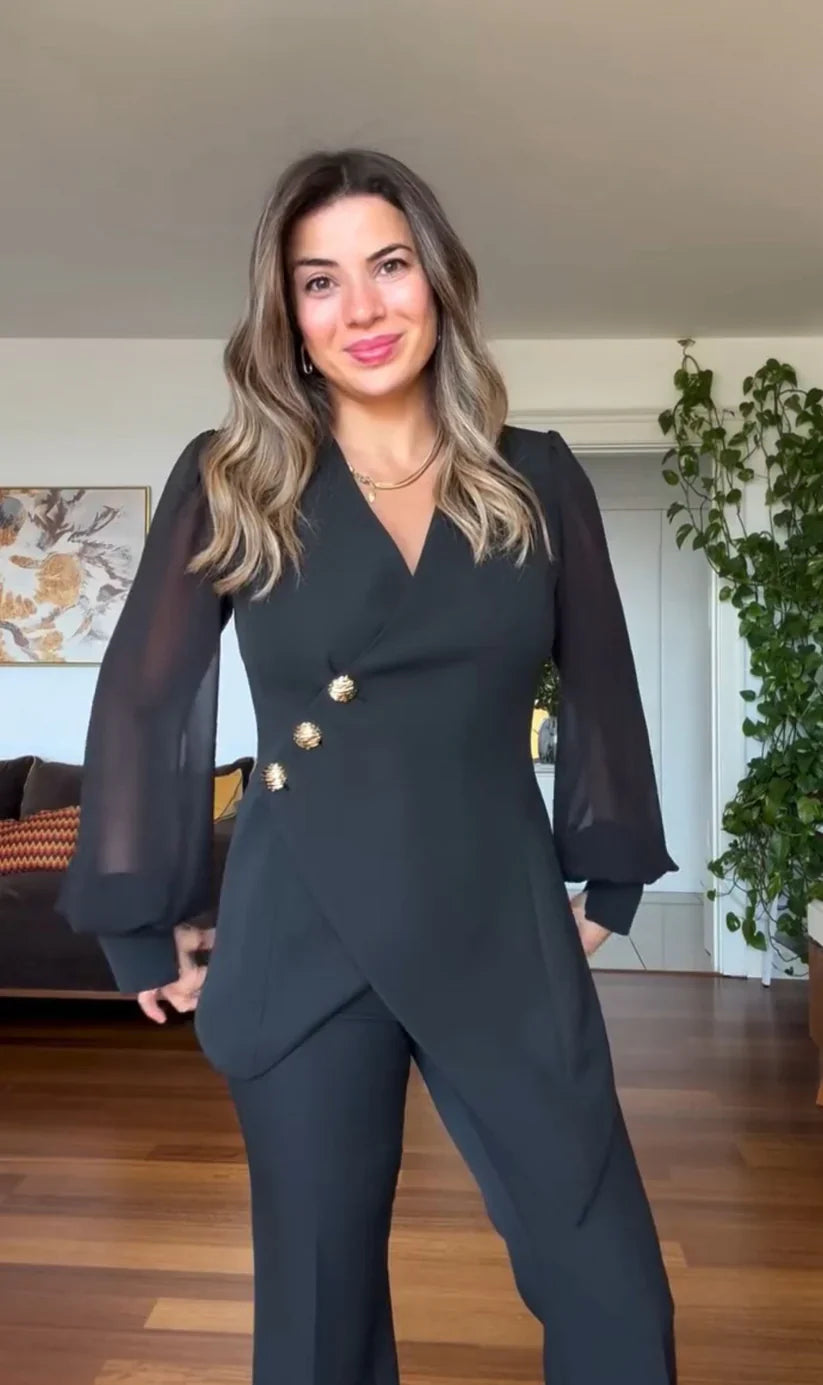 Καλλίστη – Κομψό μαύρο σετ με διαφάνειες και χρυσά κουμπιά